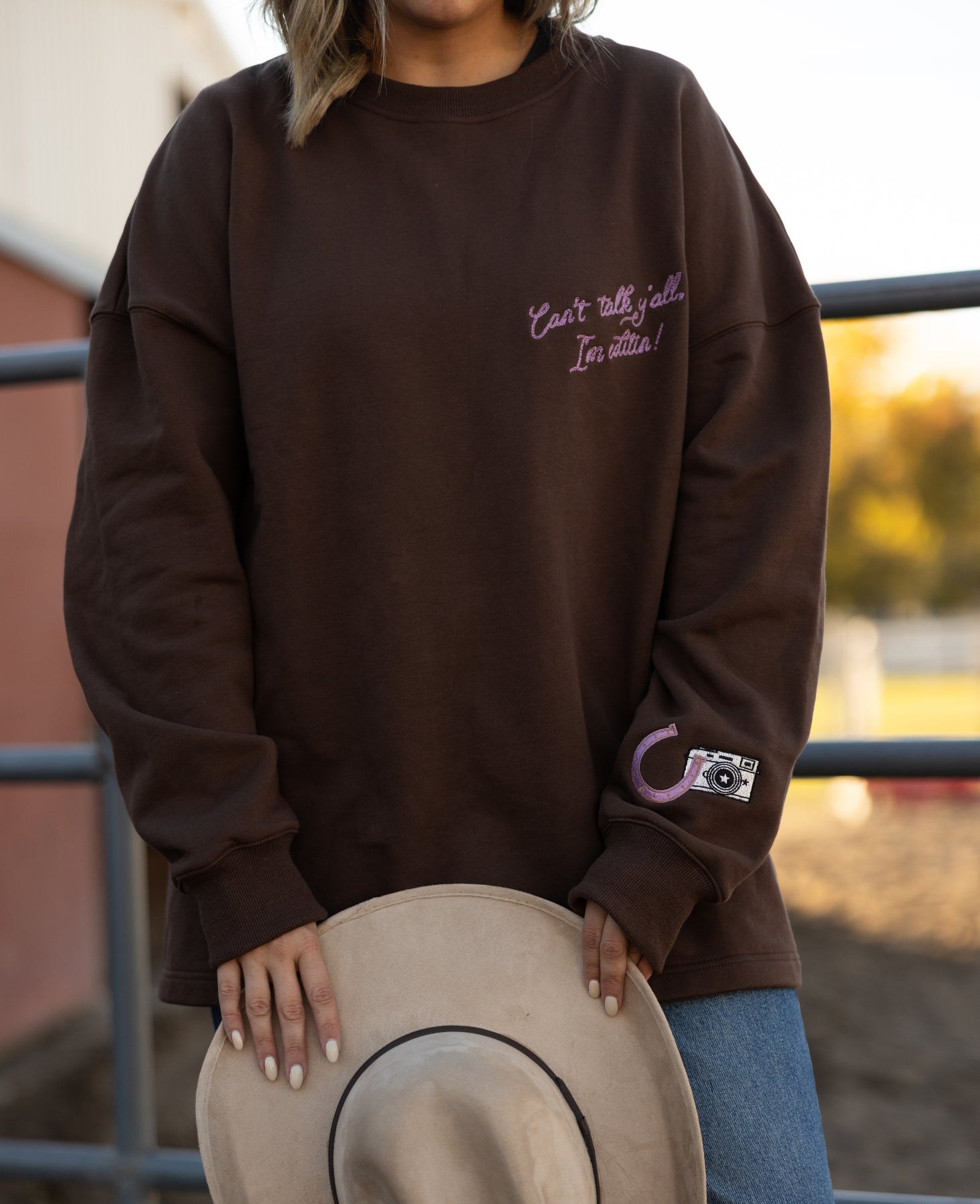 Front: Embroidered “Can’t talk y’all, I’m editin’!” in pink script