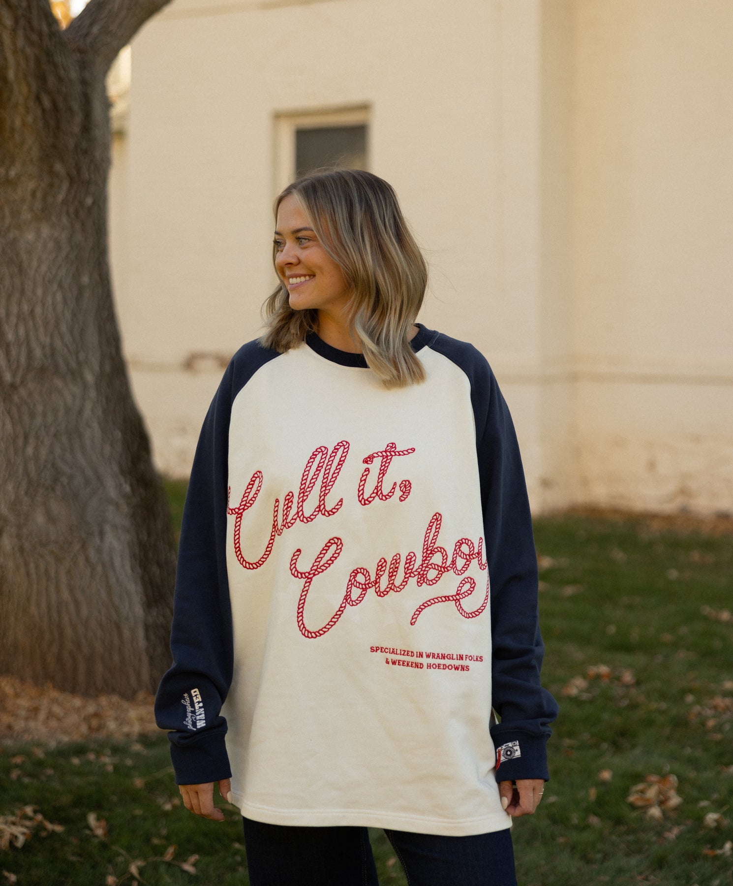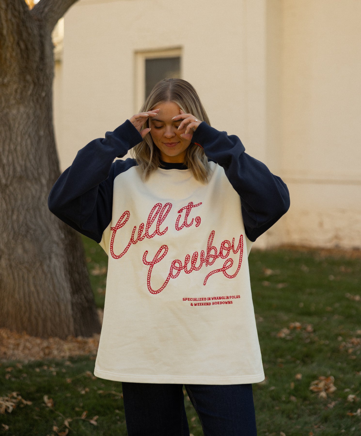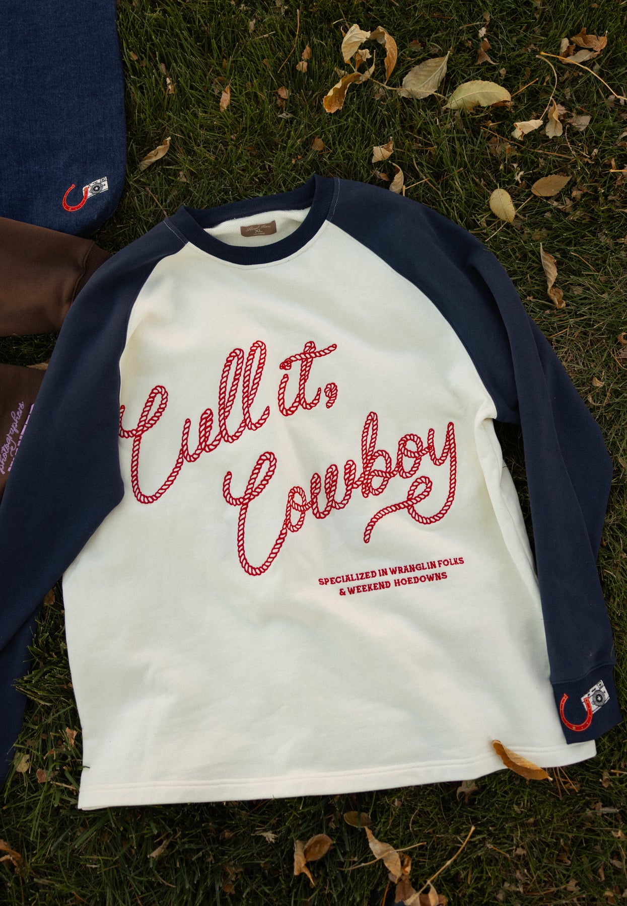Cream body with deep navy sleeves and bold rope-style embroidery that reads “Cull It, Cowboy.”